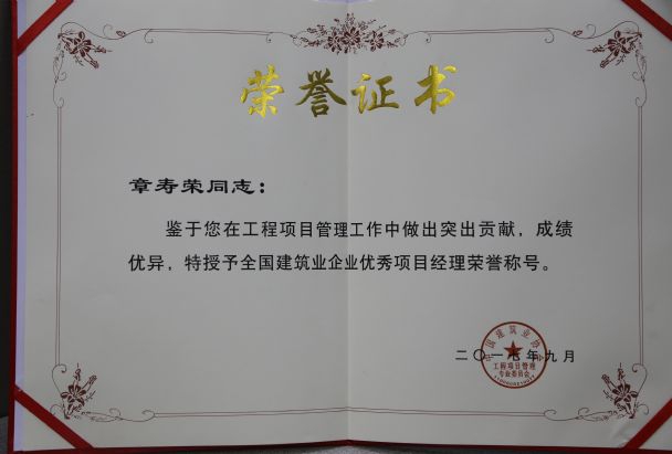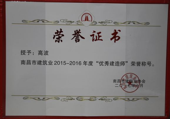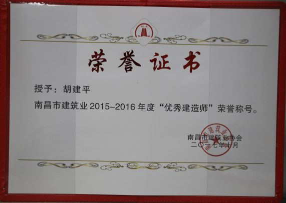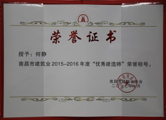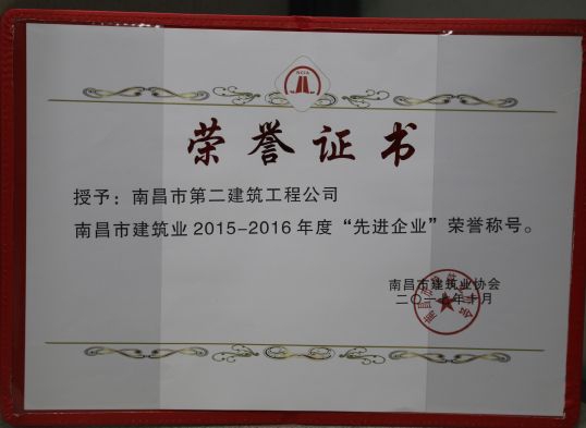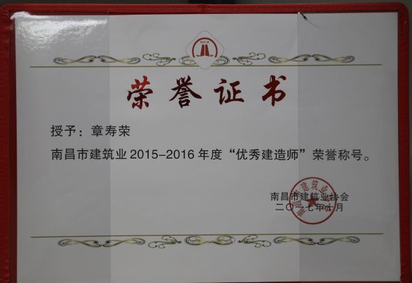 南昌市建筑業(yè)協(xié)會對公司頒發(fā)了南昌市建筑業(yè)2015-2016年度“先進企業(yè)”榮譽稱號,對公司建造師章壽榮、何靜、胡建平、高波頒發(fā)了南昌市建筑業(yè)2015-2016年度“優(yōu)秀建造師”榮譽稱號;中國建筑業(yè)協(xié)會對章壽榮頒發(fā)了全國建筑業(yè)企業(yè)優(yōu)秀項目經(jīng)理榮譽稱號。
