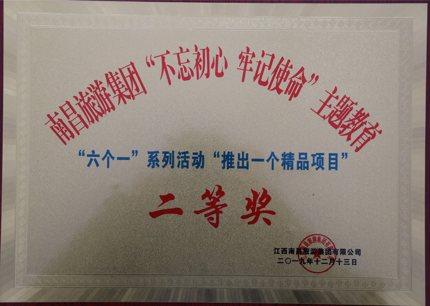 12月13日下午,南昌旅游集團(tuán)在滕王閣會見廳召開“不忘初心、牢記使命”主題教育“六個一”活動暨董事長獎勵表彰大會,我公司參評的“推出一個精品項(xiàng)目”榮獲二等獎,“突破一個基層難點(diǎn)”榮獲三等獎,“樹一個模范人物”、“講一個初心故事”、“擦亮一個服務(wù)窗口”、“創(chuàng)一個先鋒黨支部”榮獲優(yōu)秀獎。另外,我公司參與合作的“繩金塔項(xiàng)目EPC招標(biāo)攻堅(jiān)團(tuán)隊(duì)”榮獲董事長特別獎。