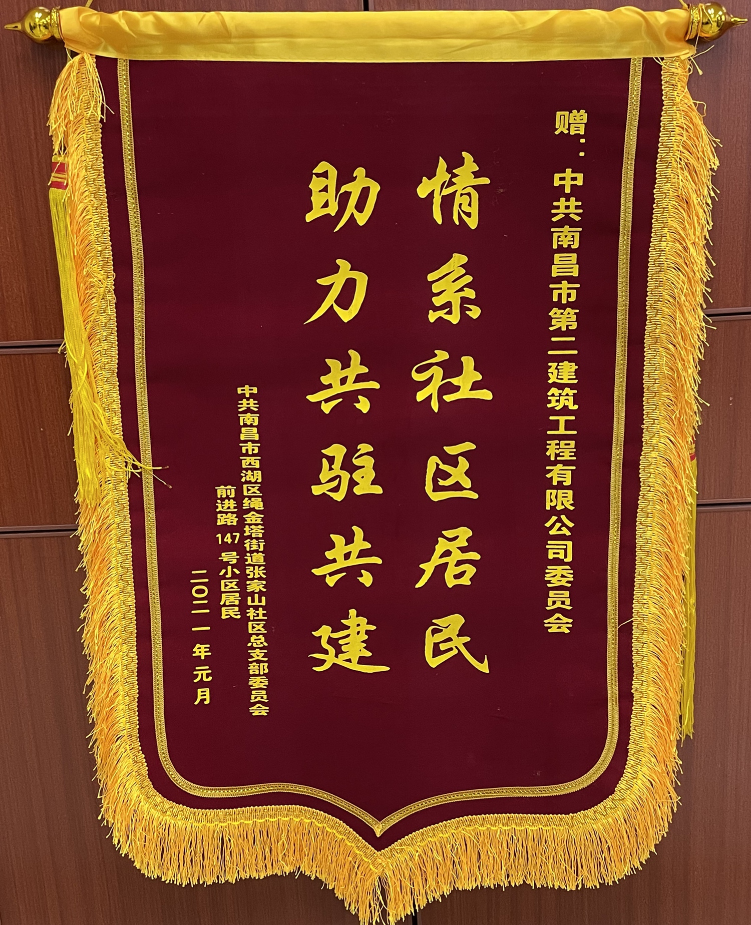 3月9日下午,南昌市西湖區(qū)張家山社區(qū)干部群眾一行來到南昌市第二建筑工程有限公司,代表社區(qū)黨總支部和20多戶社區(qū)居民向公司黨委書記、董事長王彥送上“情系社區(qū)居民,助力共駐共建”錦旗,并再三表示感謝,言語之間,情意切切。