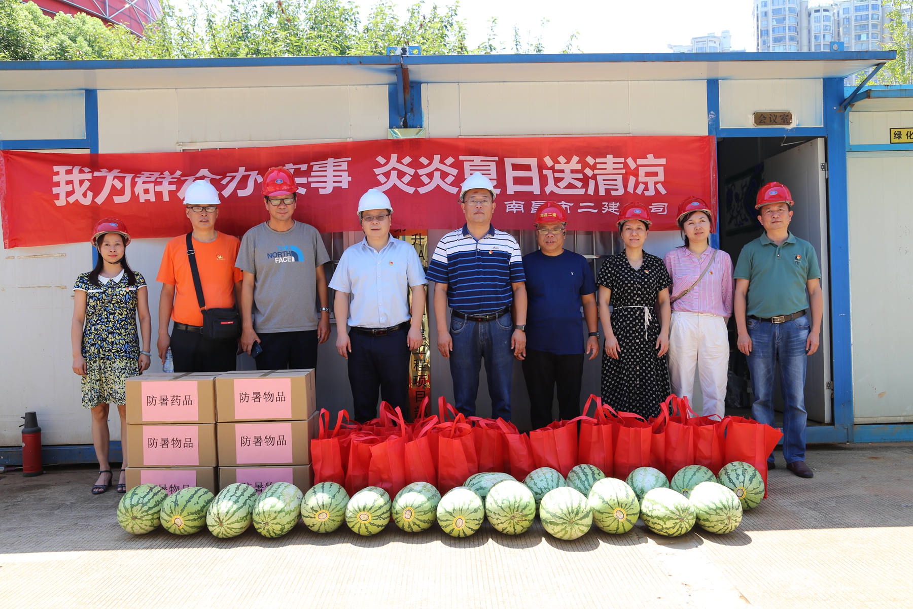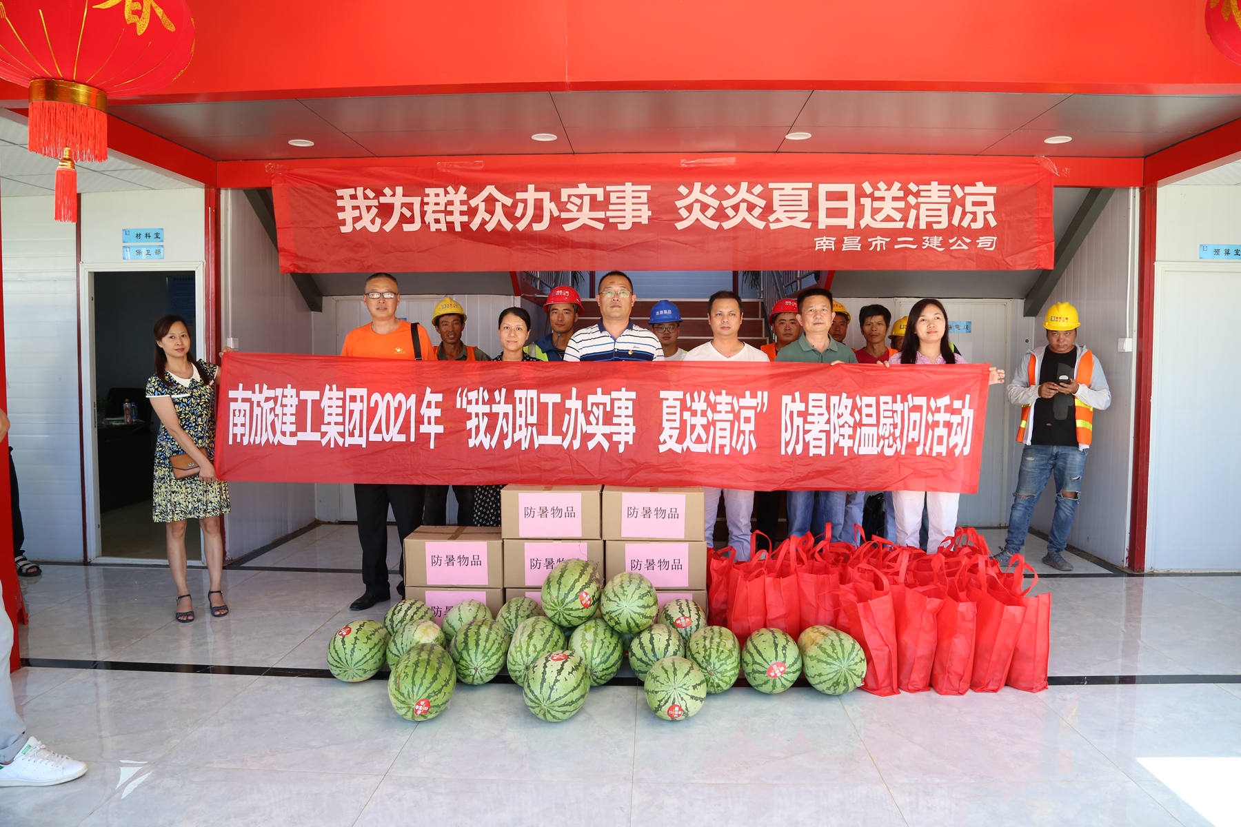 烈日炎炎,持續(xù)高溫。為了給奮戰(zhàn)在工程一線的廣大員工帶去企業(yè)的關(guān)懷,7月22日,公司相關(guān)部門在南旅建工集團(tuán)總經(jīng)理、公司黨委書記、董事長(zhǎng)王彥,南旅建工集團(tuán)黨委副書記、常務(wù)副總經(jīng)理龔戩,公司紀(jì)檢書記王小華、工會(huì)主席付蓉等領(lǐng)導(dǎo)率領(lǐng)下,先后來到“繩金塔民俗風(fēng)情街”工程項(xiàng)目部、“滕王閣南擴(kuò)”項(xiàng)目部及“南昌市第六糧庫易址重建”工程項(xiàng)目部,開展“我為群眾辦實(shí)事 炎炎夏日送清涼”活動(dòng)。每至一處,送上大批西瓜、綠豆、冰糖等防暑物品及藥品,并詢問項(xiàng)目部防暑降溫工作落實(shí)情況,督促項(xiàng)目部把工程建設(shè)與職工健康安全同時(shí)抓牢實(shí),確保項(xiàng)目建設(shè)正常推進(jìn)。