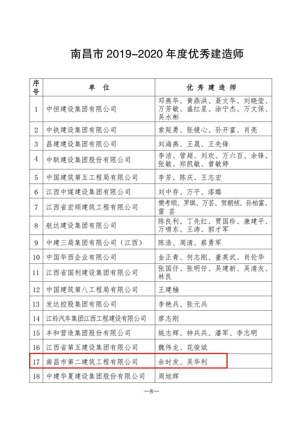 為表彰先進、樹立典型,鼓勵建筑業(yè)做大做強,著力推動我市建筑業(yè)快速健康發(fā)展,南昌市建筑業(yè)協(xié)會開展全市 2019—2020 年度南昌市建筑業(yè)先進企業(yè)和優(yōu)秀建造師(監(jiān)理師)評選活動。經(jīng)企業(yè)申報、市建協(xié)評審、綜合市建設局相關職能部門意見,共有 82 個單位被評為南昌市建筑業(yè)先進企業(yè) ,151 名建造師被評為南昌市建筑業(yè)優(yōu)秀建造師,其中,我公司再次獲評市“先進企業(yè)”、余時發(fā)和吳華利被評為市“優(yōu)秀建造師”稱號,并受到表彰。